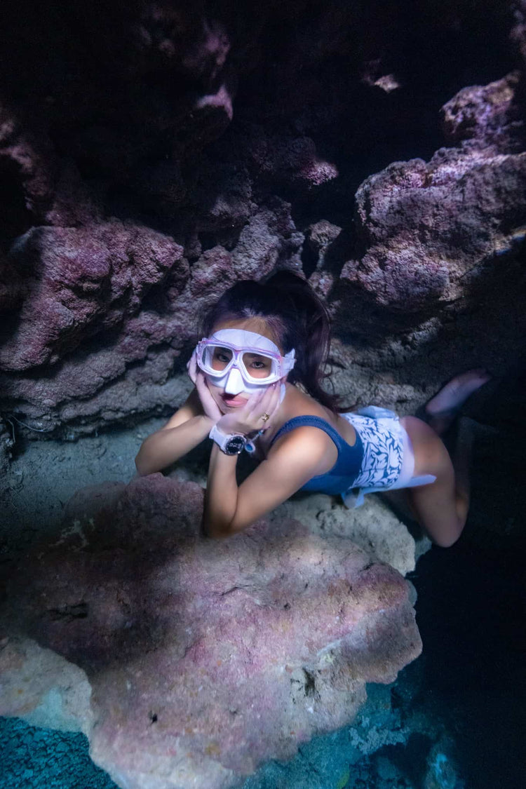 - マスクのフィット感、ストラップの締め具合がキツすぎる等、体調が優れない場合、スキル状況によっては浅い深度においてもマスクスクイズ(水圧の影響でマスクが顔に押し付けられること)や耳抜きがしづらい事象が起きる可能性がございます。マスクブロー(鼻から息を吐いて押し付けられたマスクを元に戻すこと)を行ってもマスクスクイズが解消されない、耳抜きをしようとしてもできずに無理をし潜行を続けると、眼の内出血、鼻血、頭痛、鼓膜の炎症・裂孔等を引き起こす恐れがあります。異変を感じたら直ちにダイビングを中止し、状況によっては医師の指示を仰ぐようお願い致します